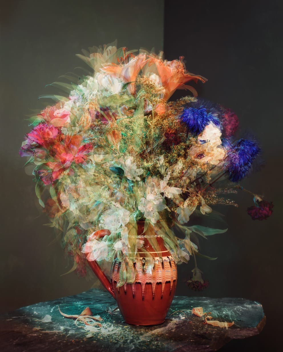 kukintovaiheesta kuihtumiseen. Jokainen teos on kuvattu useamman kuvauskerran aikana ja toteutettu yhdistelemällä digitaalisia negatiiveja toisiinsa. Kuvissa staattinen, paikallaan pysyvä kamera tallentaa kukkien liikkeet samaan kuvaan.