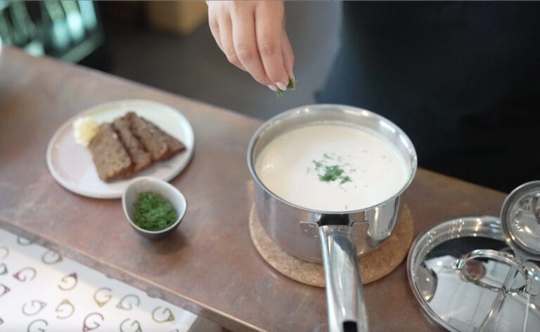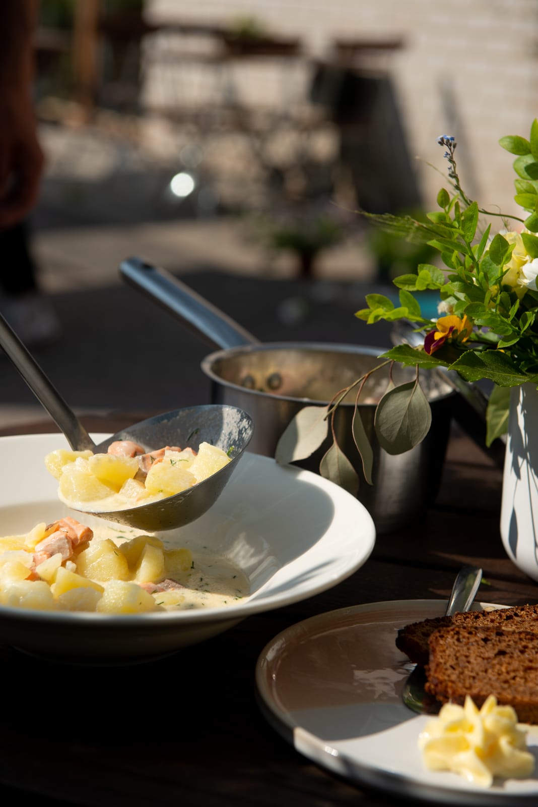 Keitto tuodaan pöytään kattilassa henkilömäärän mukaan.