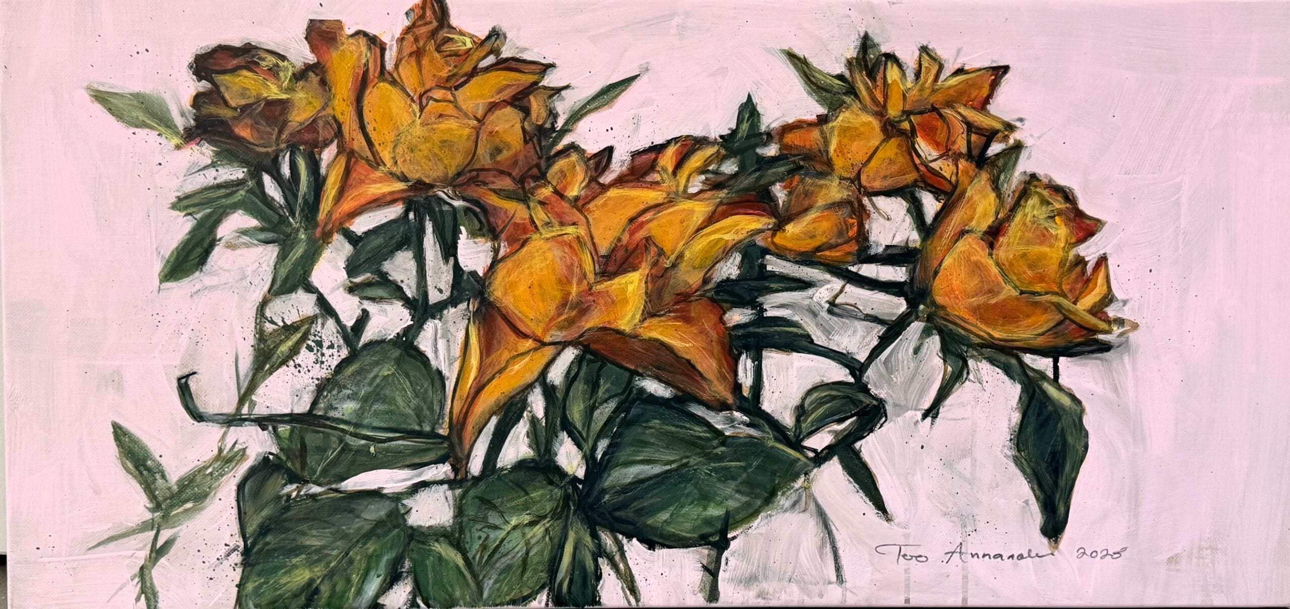 Elämän suuriin hetkiin liittyy aina kukat, erityisesti ruusut. Ne ovat hiljaisia todistajia syntymälle, rakkaudelle ja kuolemalle. Maalauksissaan Annanolli tutkii viivaa ja kuolevia kukkia – sitä, miten kukka muuttuu, kun se vapautuu elollisuuden kahleista. Kukan anatomia on hänelle elämän anatomiaa: miten elämä rakentuu, kukoistaa ja hiljaa purkautuu osiin. Kukan kuivuminen ei ole loppu, vaan pysähtynyt liike, joka paljastaa olemisen kerrokset. Annanollia kiinnostaa erityisesti ruusu, sillä siihen kiteytyy koko ihmisyyden mitta: intohimo ja hauraus, ärsytys ja lumoutuminen, muisti ja symboli.