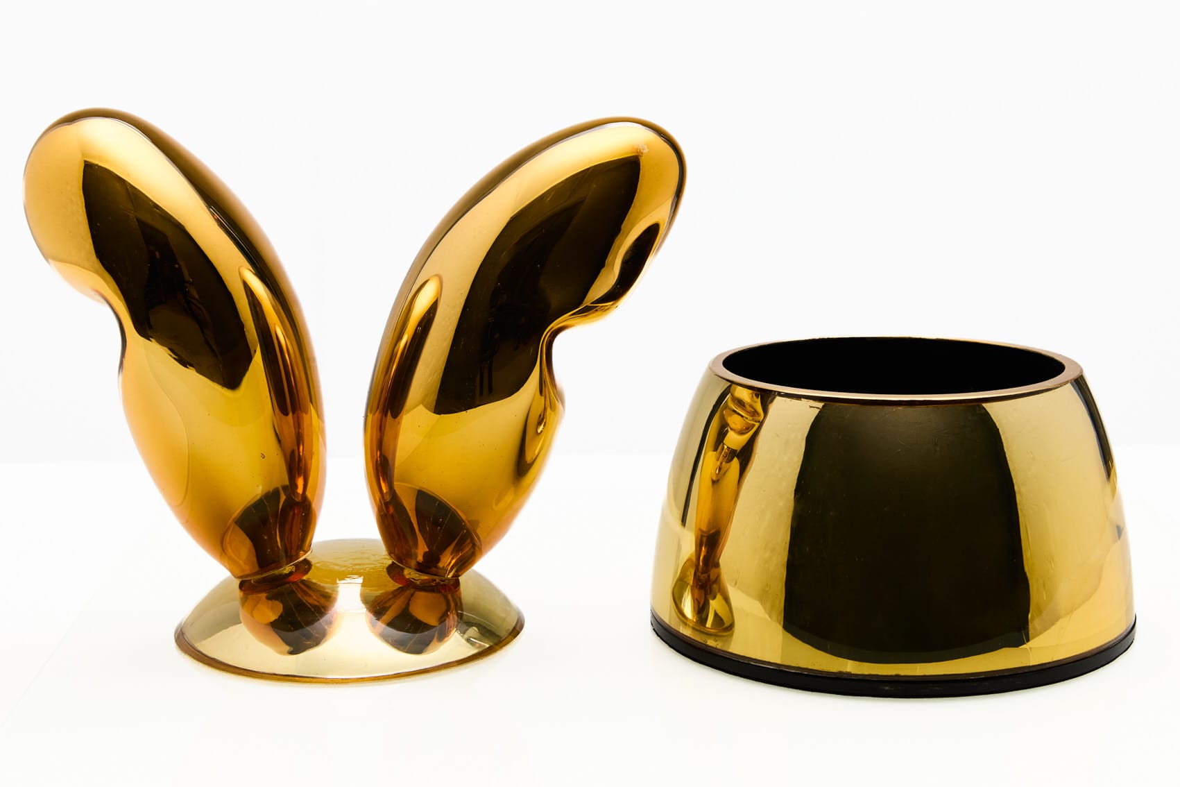 Vapaasti puhallettu lasi, hopeoitu, reunat kullattu 24K, musta nahka